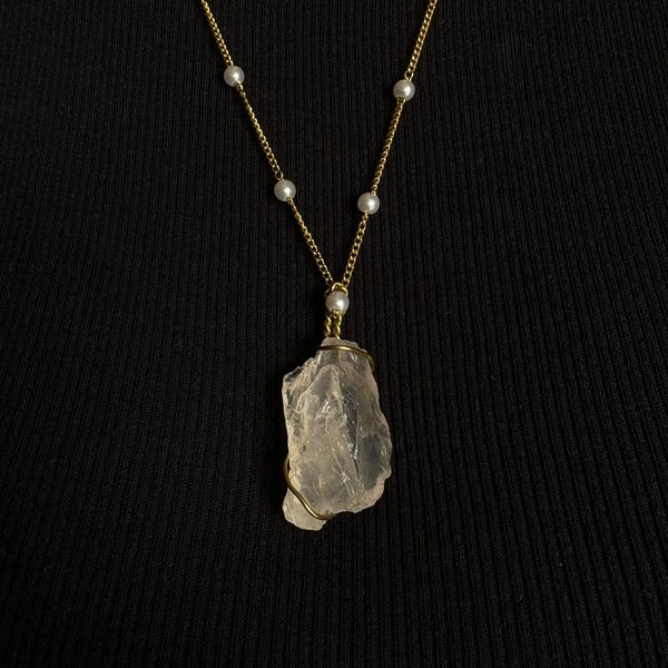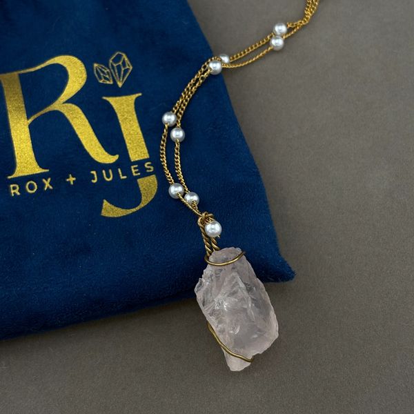 She wanted presence without noise. A stone that could be worn every day. Something soft, radiant, and quietly strong. From that intention, this rose quartz pendant was born. Raw, uncut, and wrapped only at its edges, her stone breathes freely. Its pale tone glows softly against any backdrop, offering versatility in visual aesthetic and providing the vibrational energy we crave from a rose quartz crystal. The intentional union of rose quartz and mother of pearl is a pairing of heart and harmony. Rose quartz opens and softens the emotional body, while mother of pearl steadies it, creating an aura of calm receptivity.